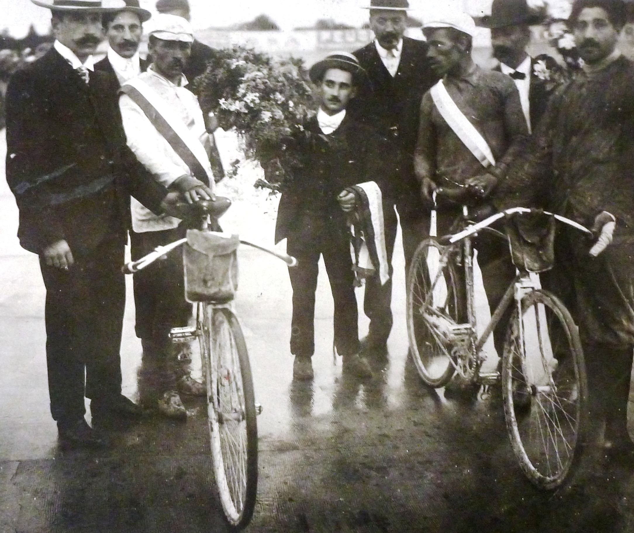 - Bron: Wikimedia Commons. Unknown author | spaarnestadphoto. | Wielrennen, Tour de France, 1903. De eerste Tour de France met vertrek en aankomst in Parijs met winnaar Maurice Garin. [2e van links M.Garin]