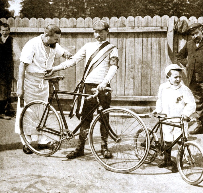 - Bron: Wikimedia Commons. Unknown author | privat Maurice Garin nach seinem Sieg bei der Tour de France 1903, rechts der Zweitplatziere, Léon Georget