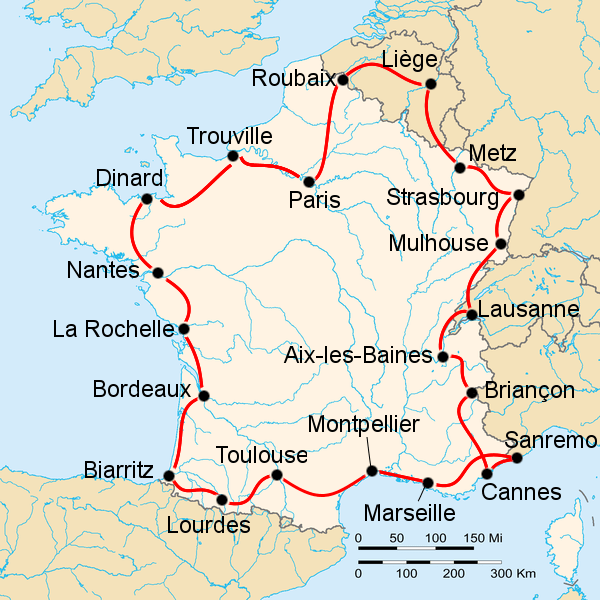 Route of the 1948 Tour de France, starting and finishing in Paris. The black dots are the cities that hosted a stage start and finish.