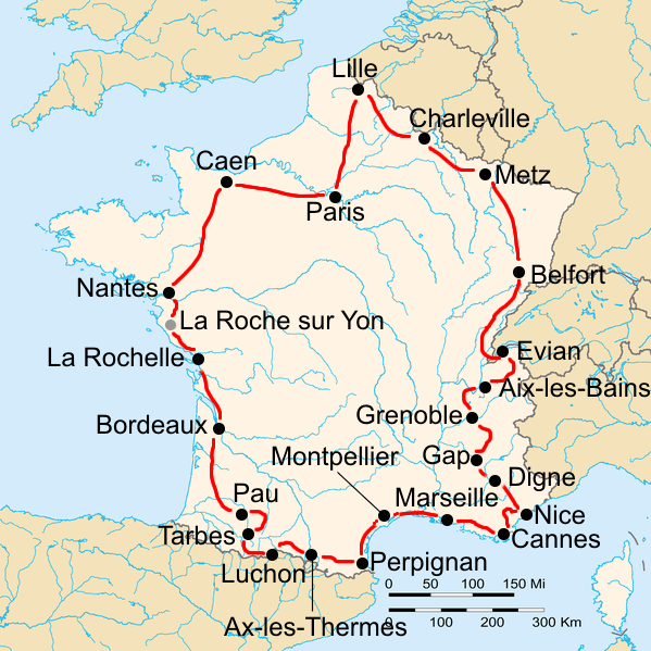 derivative work: EdgeNavidad (talk) | France_blank.png Route of the 1934 Tour de France, starting and finishing in Paris. The black dots are the cities that hosted a stage start and finish, the grey dots are the cities where a split stage was split.