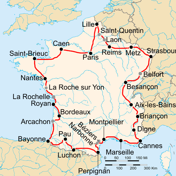 derivative work: EdgeNavidad (talk) | France_blank.png Route of the 1938 Tour de France, starting and finishing in Paris. The black dots are the cities that hosted a stage start and finish, the grey dots are the cities where a split stage was split.